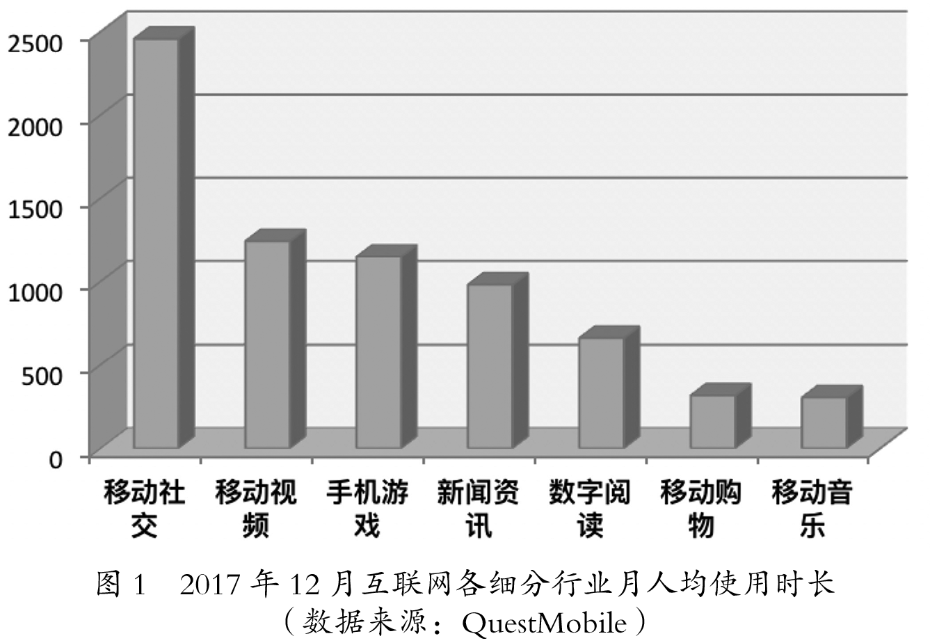 “互联网视频经历了从辅助性媒体(将电视、电影等媒体复制到网络上,以拓展媒体传播渠道)到补充性媒体(作为电视、电影等媒体的补充,提供无法在传统媒体上播放的海外电视剧、电影等)再到开拓性媒体(开发自制内容,以新媒体形式抢占传统媒体市场份额)的发展,目前已成为仅次于社交媒介的互联网核心流量入口。”[3]从互联网各细分行业月人均使用时长(图1)来看,移动视频仅在2017年12 月的月人均使用时长就接近1500分钟,超过手机游戏成为仅次于移动社交的重要流量端口。