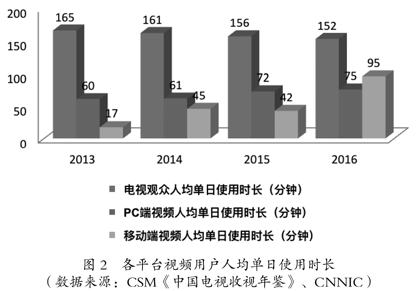 与此同时,从各平台视频用户人均单日使用时长来看,移动端视频人均单日使用时长从2013年的17分钟上升至2016年的95分钟,用户使用时长快速增长,互联网视频移动化趋势不断加剧。(见图2)