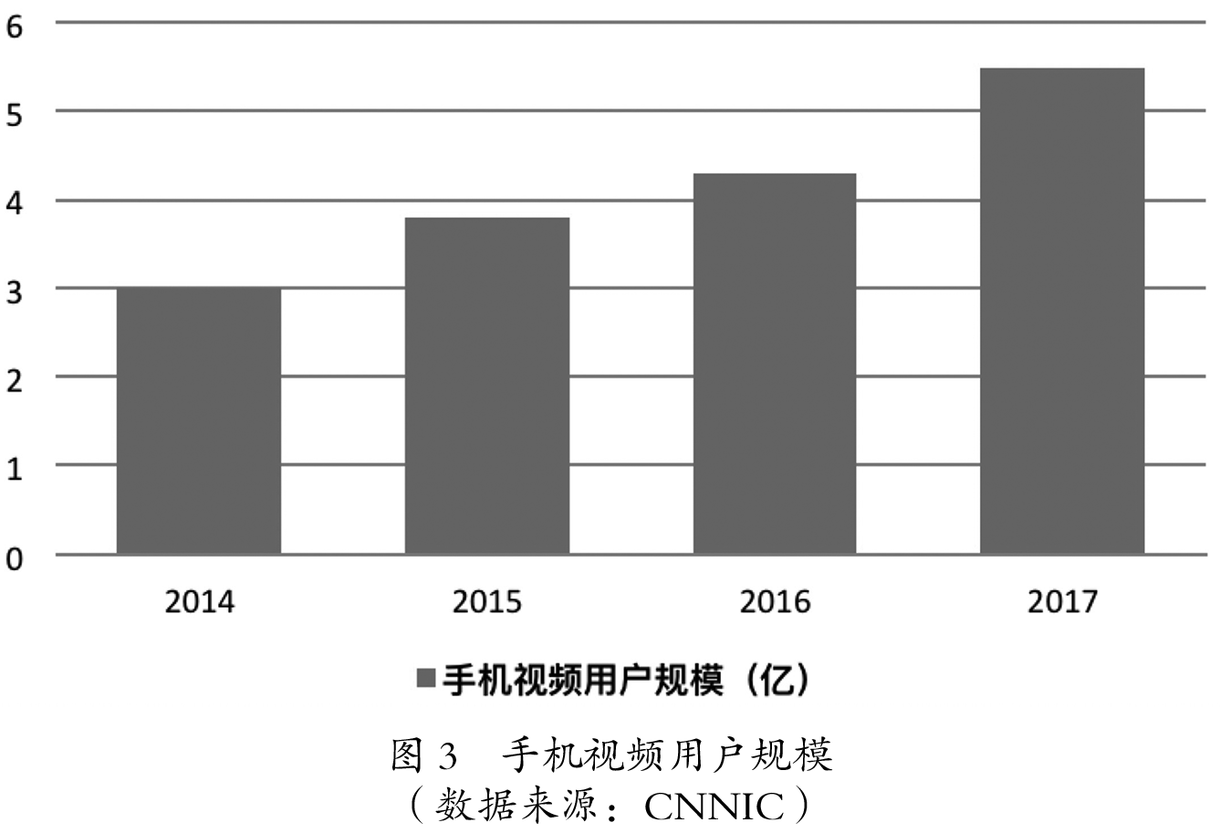 这种强劲的发展趋势,一方面与移动技术的成熟和普及密切相关。从手机视频用户规模(图3)来看,2017年,我国手机视频用户使用规模达到了5.49亿人,并呈现出了不断增长的趋势;另一方面,网络资费的大幅度下调,使得用户越发倾向于在移动端观看视频。“对于数字原生代和数字移民而言,屏幕已开始有了类似的功用。他们与手机的体验和关系变得更有意义、更重要。”[4]