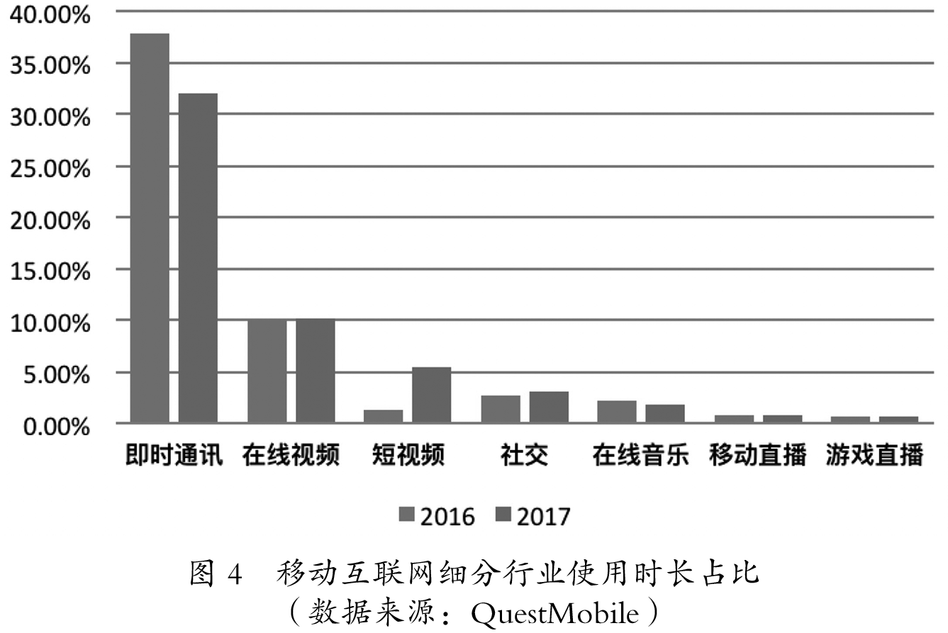 2017年以来,短视频行业迅速崛起。如图4显示,2017年短视频使用时长占互联网使用总时长的5.5%,而2016年这一比例仅为1.3%,增长幅度远超其他细分类型。移动直播未发生变化,占比仍为0.8%。前文在论述“移动直播”时分析过,直播在时间上因为不是碎片化的观看方式,不符合移动用户的观看习惯,而“短视频”是真正的碎片化影视传播形态,短则论秒,长则两三分钟,与移动用户碎片时间的观看习惯形成完美配对;从数据流量费用上分析来看,短视频的流量花费要远远低于观看直播的移动流量费用。此外,短视频借助微信等社交媒体获得了更广阔的传播渠道。