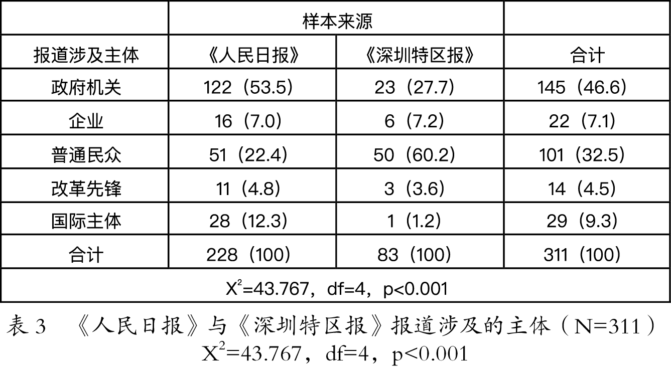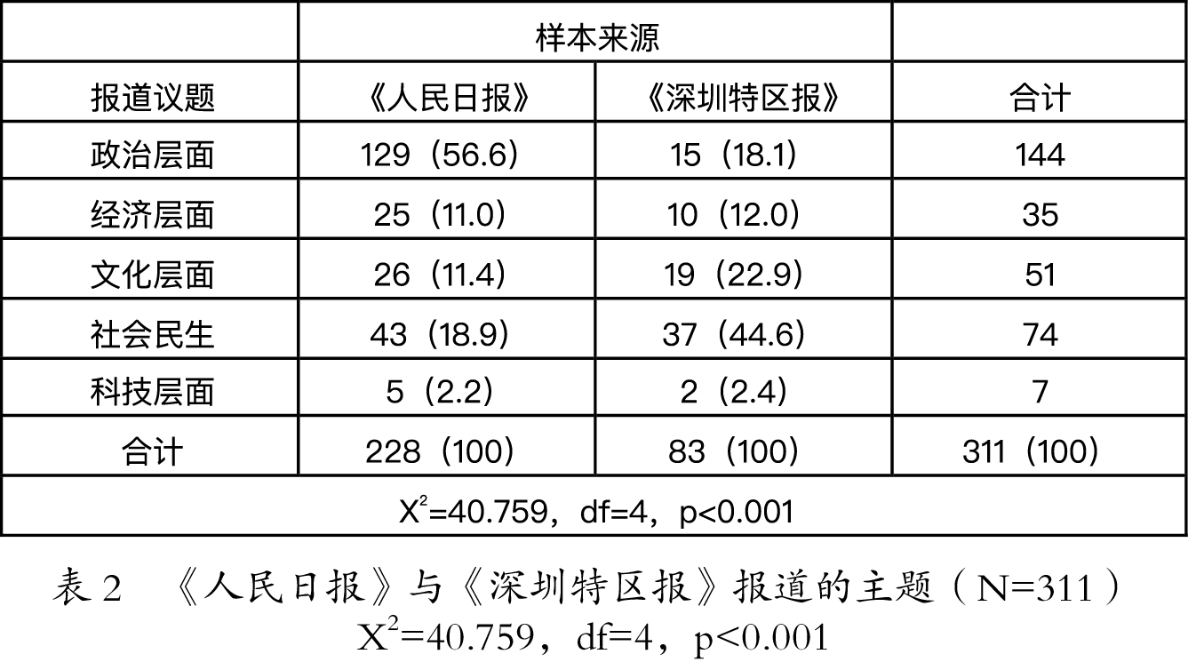 根据表2的统计数据可知,《人民日报》和《深圳特区报》在报道主题的取舍上有所不同。《人民日报》的报道中更多关注的是政治层面,较好地担当了耳目喉舌的作用,充当了改革开放40周年信息的播报者。《深圳特区报》则更多关注改革开放40周年与民众日常生活的关系,体现了地方媒体的特性。