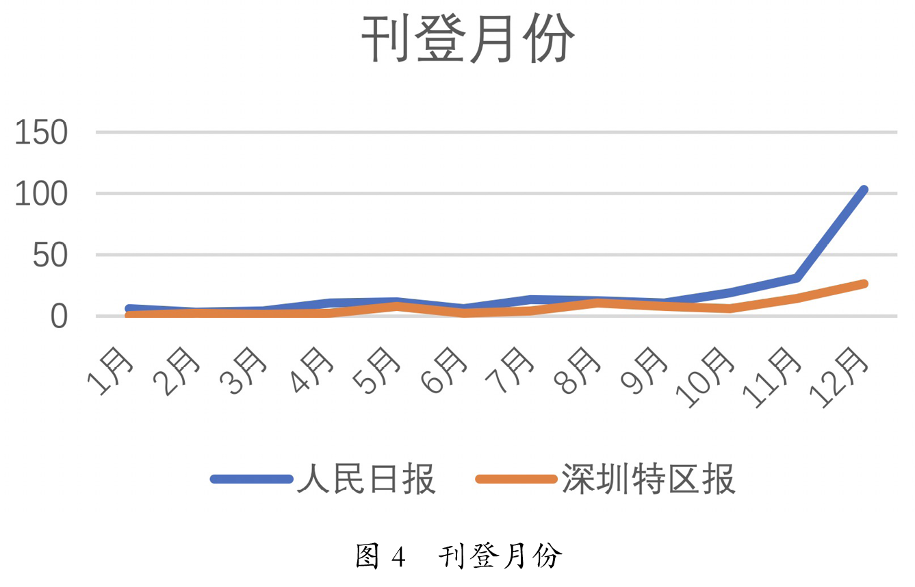 在对改革开放40周年的月报数量分析中,如图4所示,2018年一整年《人民日报》及《深圳特区报》对改革开放40周年的报道几乎没有中断,10月开始关于改革开放40周年的报道呈显著上升趋势,报道数量波峰出现在改革开放日所在的12月份,即波峰出现在纪念日前后。
