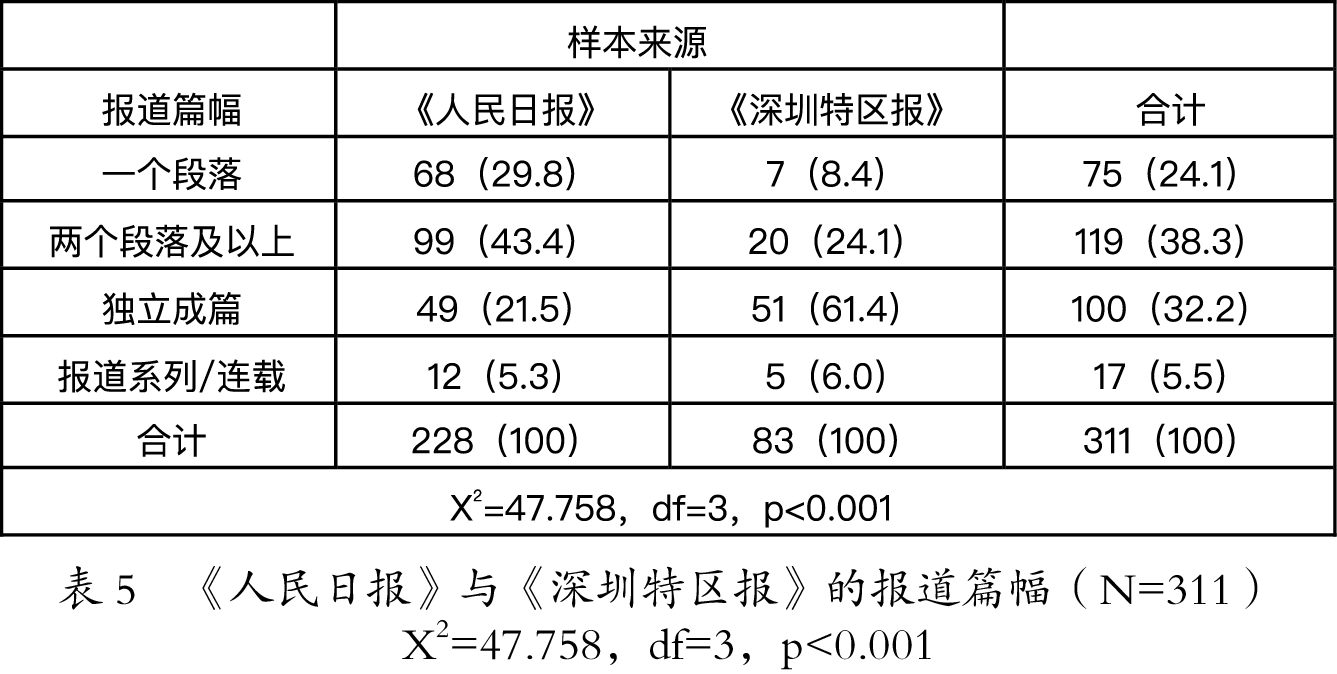 此外,我们从表5的数据可以发现两个媒体的“系列报道”严重缺失,系列报道的内容多是改革先锋的人物表彰。由此可以看出,《人民日报》和《深圳特区报》都缺乏对新闻议题的持续性的关注和深度挖掘,这是媒体在报道重大新闻议题时需要改进的问题。
