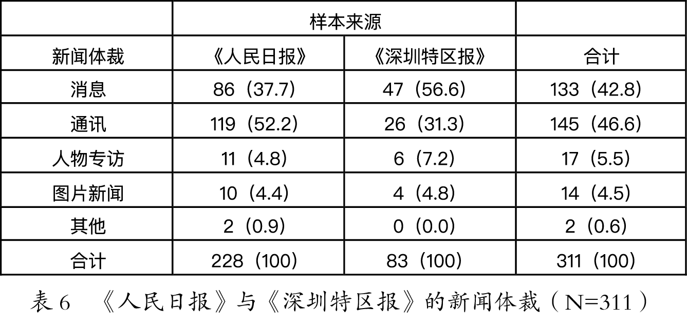 新闻体裁,是指新闻所报道内容的表现形式。本研究根据《人民日报》和《深圳特区报》对改革开放40周年的具体报道,将新闻体裁分为消息、通讯、人物专访、图片新闻和其他五大类。根据表6的数据可知,《人民日报》中通讯报道数量占多数(52.2%),其次是消息(37.7%)、人物专访(4.8%)、图片新闻(4.4%);《深圳特区报》中消息最多(56.6%),其次是通讯(31.3)%、人物专访(7.2%)、图片新闻(4.8%)。